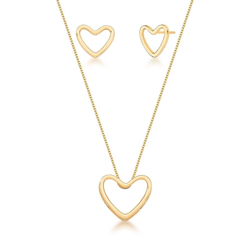 Conjunto colar em malha veneziana com pingente de coração liso e vazado e brinco de coração liso e vazado banhado a ouro.